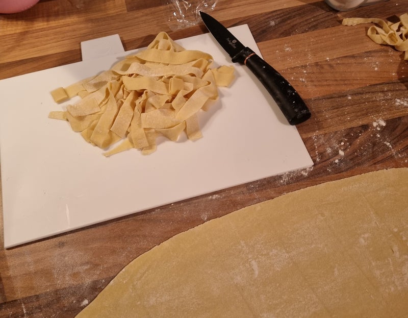 Maak er daarna pasta naar keuze van (bv fettuccine, spaghetti of parpadelle) en laat circa 15 minuten drogen met wat extra bloem.