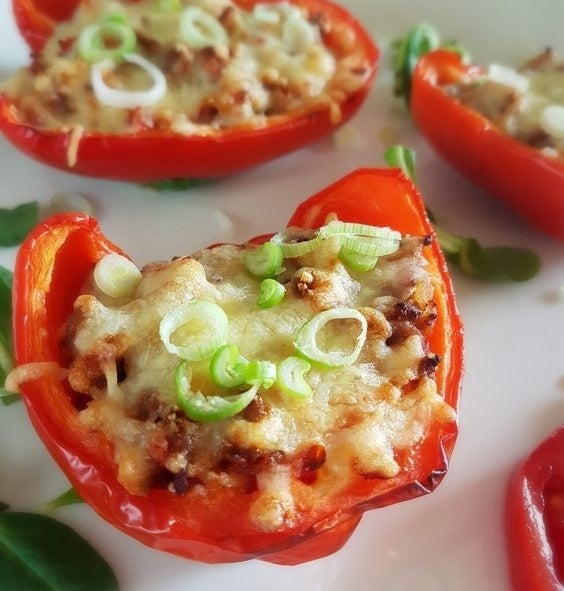 Bak de paprika's in de oven voor circa 15 minuten (afhankelijk van je eigen oven) of tot de paprika's zacht zijn. Garneer met de rest van de bosui.