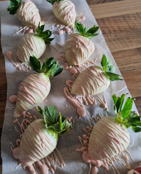 Als je alle aardbeien hebt gedaan, zet je ze even in de koeling tot de chocolade is uitgehard.