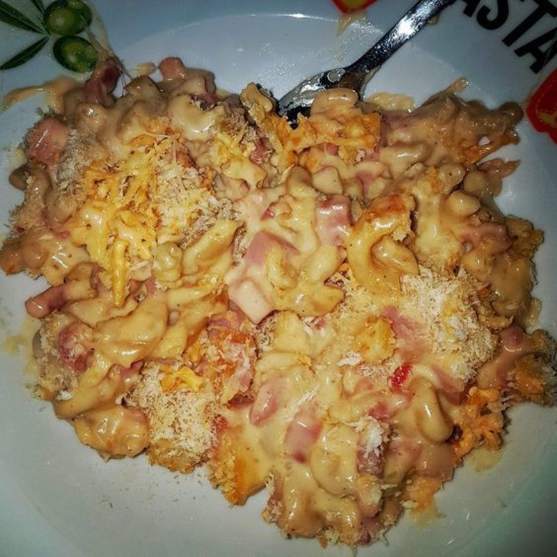 Vet een ovenschaal in met wat olie. Meng de macaroni, spek en ham door de kaassaus en giet het hele mengsel in de ovenschaal. Top met panko en geraspte kaas.