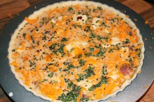 De hoofd ingrediënten van deze quiche zijn kaas en bacon maar je kunt er ook heel groente aan toevoegen mocht je dat willen, paprika is bv heel lekker erbij.