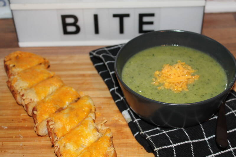 Serveer de courgettesoep met een heerlijk cheddar, ui & knoflookbrood (stokbrood besmeren met een ui en knoflookboter en daarover een flinke lading cheddar kaas strooien, dan afbakken in de oven) óf met een verse stokbroodje en kruidenkaas.