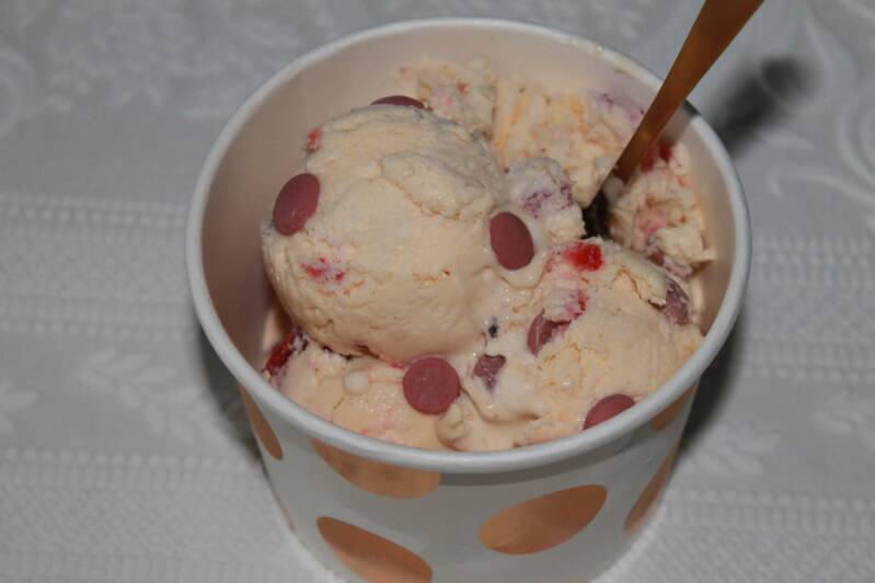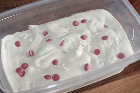 Meng het fruit en de chocolade door de ijs mix heen en giet het geheel over in een diepvries bak.